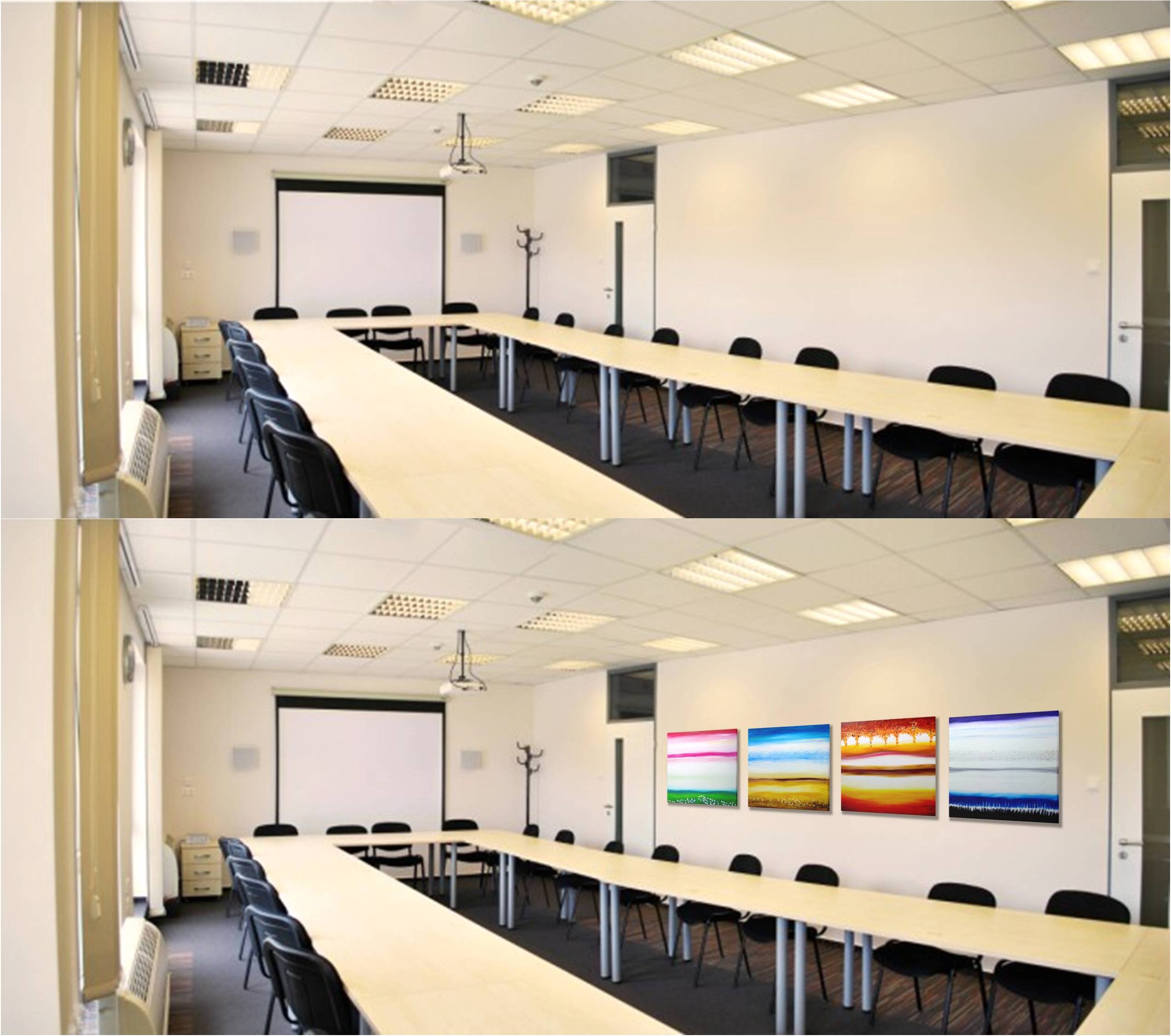 Ahogy a kollégák motiváltsága, kreativitása is növekszik egy pozitív rezgésű környezetben, úgy az üzleti partnerekkel való tárgyalások sikerességére is hatással lehet egy jól megválasztott festmény.